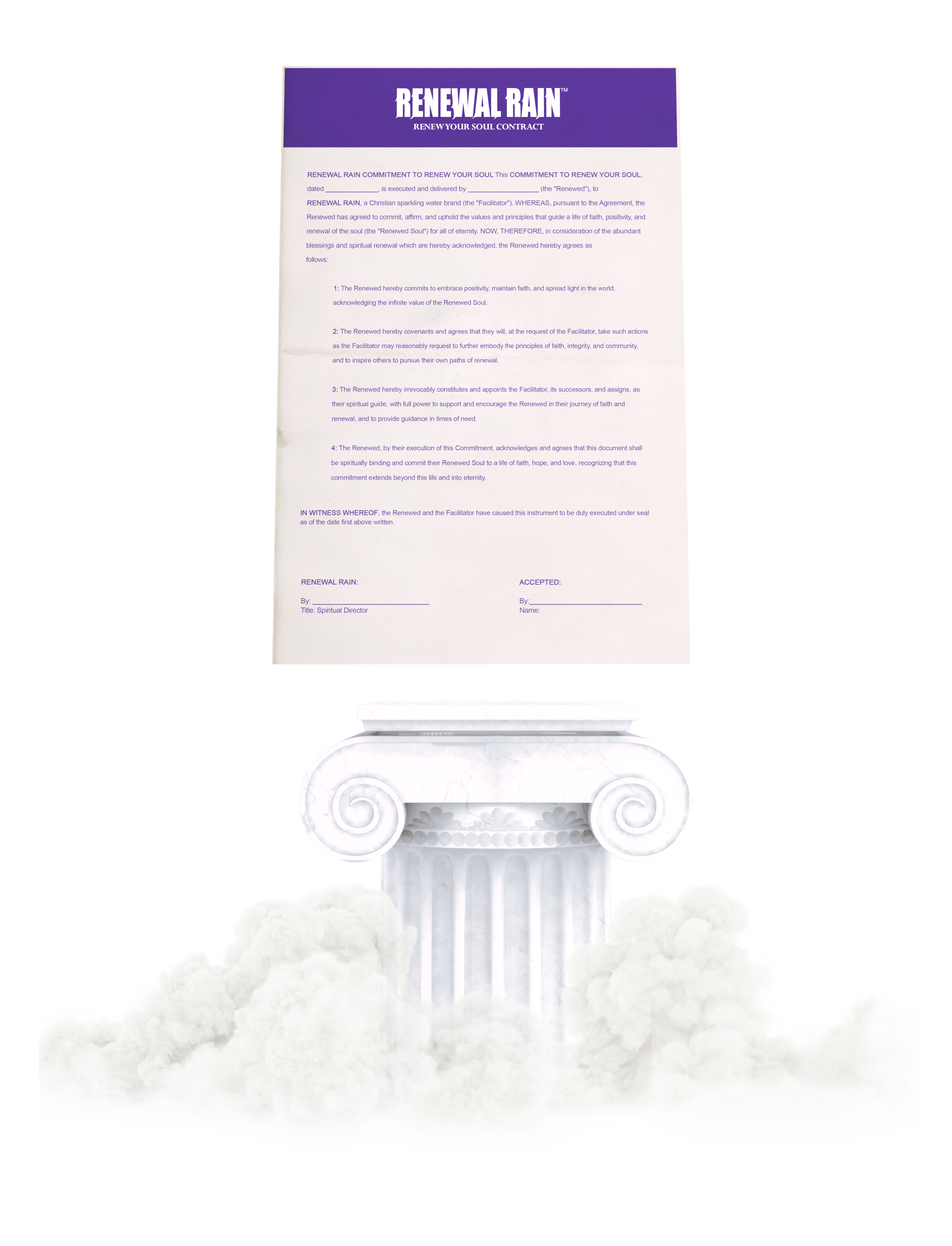 We believe in more than just quenching your physical thirst...we aim to rejuvenate your spirit. Our Soul Renewal Contract is a unique commitment to embrace positivity, maintain faith, and spread light in the world. By signing this contract, you are pledging to uphold the values and principles that guide a life of faith, integrity, and community. This spiritually binding agreement is designed to inspire you and others on a path of renewal, transcending beyond this life and into eternity.