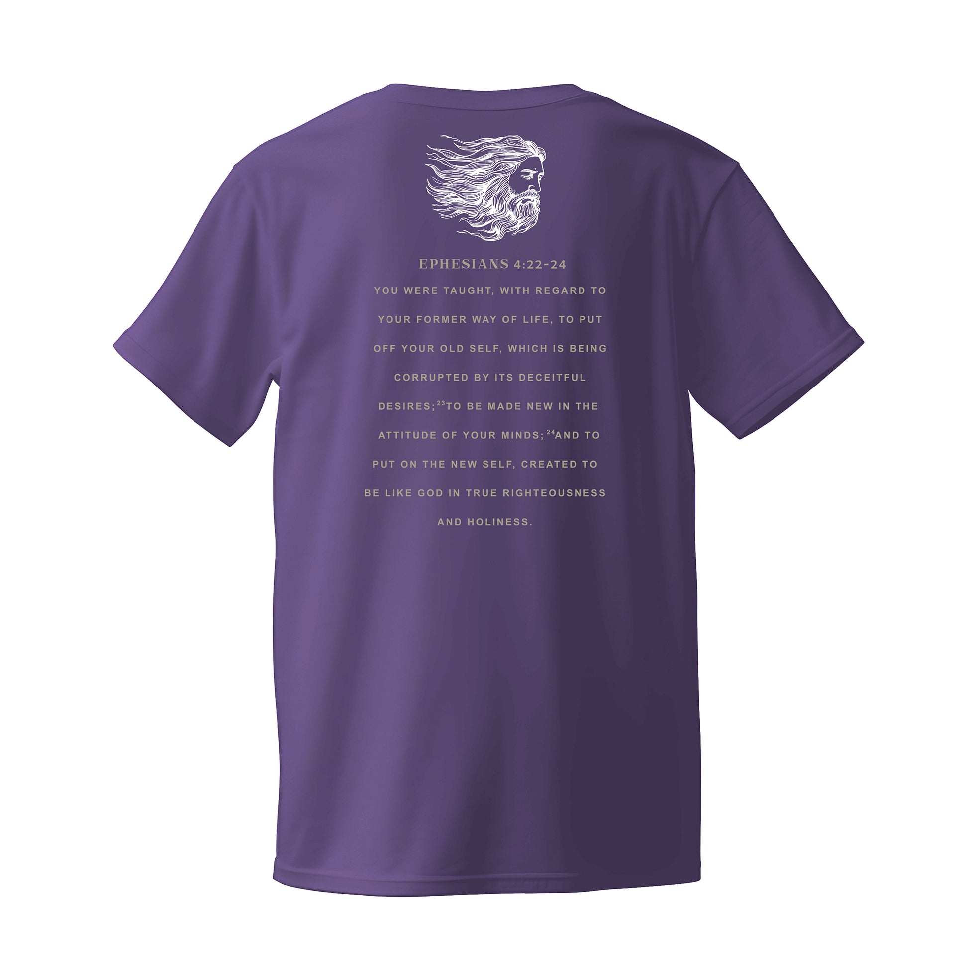 • Inspirational Scripture: The tee features the powerful verses from Ephesians 4:22-24: “Put off your old self, which belongs to your former manner of life and is corrupt through deceitful desires, and to be renewed in the spirit of your minds, and to put on the new self, created after the likeness of God in true righteousness and holiness.”
